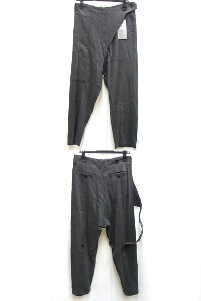 ◆新型のワインドワイドトラウザースはフロントのカヴァード部分に紐が付いており、 背面に配されたボタンに留めるデザインとなっておりますが、 外して紐を垂らしても良いアクセントとなります。 シルエットは程良くワイドとなっており タイトなトップスとの相性は抜群。 また、裾をタックアップすると独特のドレープが形成された クロップド丈になりますので、レギンスやブーツと合わせて ロングコートを羽織ってもかっこいいですね。 生地には製品洗いを施したMA_JULIUSの中ではカジュアルな 心象のレーヨンアンゴラ生地を使用。 ストレッチ入りですので履き心地も抜群です。